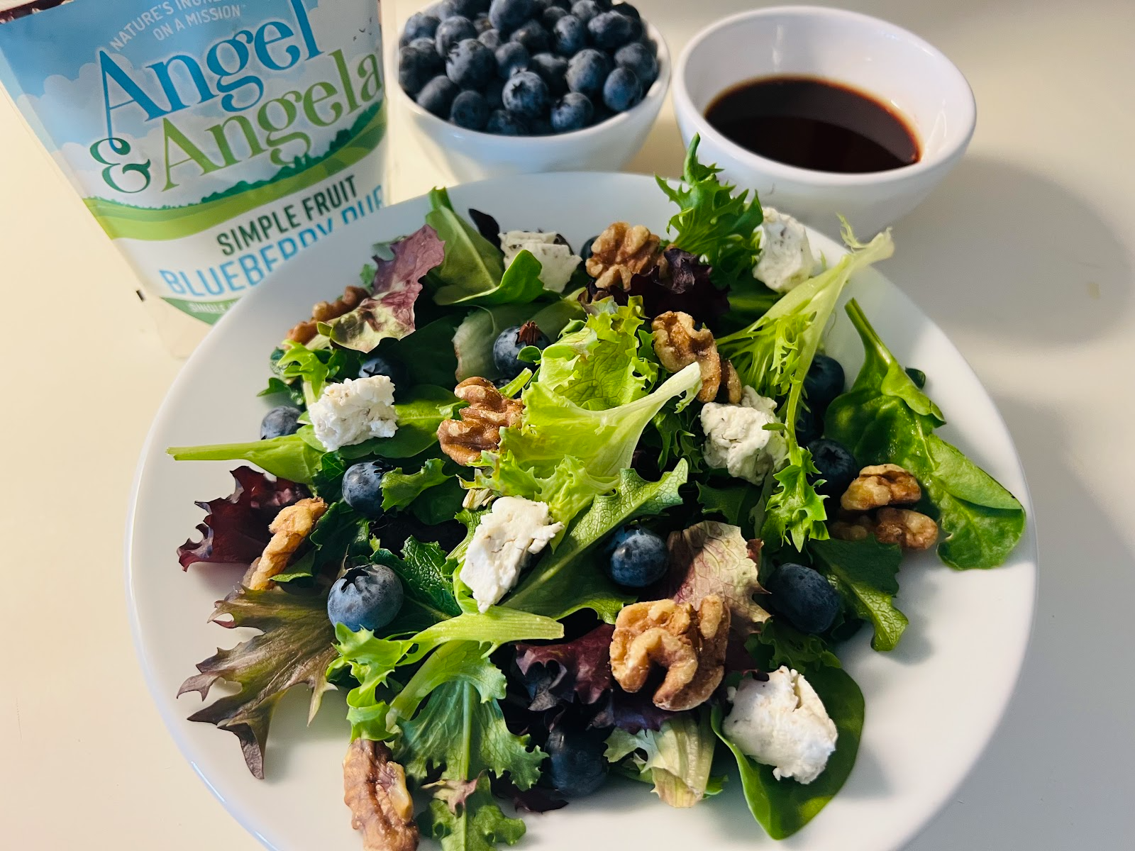 You'll Need: 1 cup Angel & Angela® Blueberry Puree, ½ cup cold pressed extra virgin olive oil, ¼ cup champagne vinegar, 3 tablespoons local honey, 1 tablespoon fresh lemon juice, salt and pepper to taste